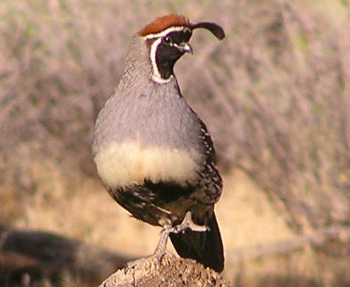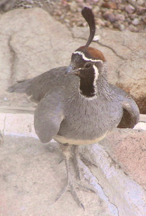 CRITTER STOP The male Gambil Quail always plays "lookout" so the family can eat without being eaten. That's the watering trough in front of him. |