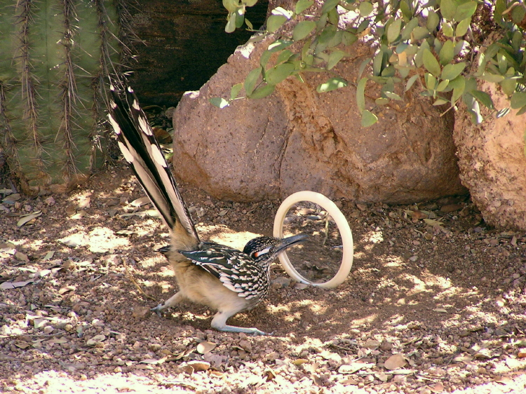 By this time, Runny had spent more than 5 hours, running frantically around the mirror. He was really upset. So, we decided to give him a break. We snuck out and removed the mirror, and left some ground beef in it's place. Runny must have thought that he had killed the "other" roadrunner. He climbed up on the bridge....