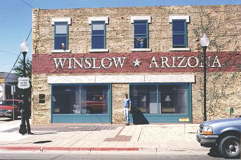 The Eagles sang it in the 70's. Now, there really is a guy 'standin' on the corner in Winslow, Arizona....although "he" is a bronze statue. It stands in front of an incredibly realistic mural, on the side of the nearby building. An "eagle", is "perched" on an upper level window ledge. In the first floor window is a "reflection" of the girl in the flatbed Ford. It looks so real that they say people wait for the eagle to take off. |