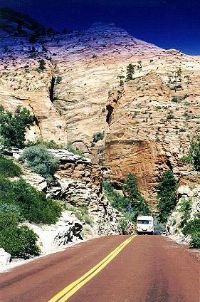 You have to see this place to believe it. You can't just look at little pictures and know what it is like. So, start packing. Oh, by the way....sorry for the dark sky at the top of the pictures, but they didn't make the windshield big enough for Zion. And, yes that's John in the last picture. |