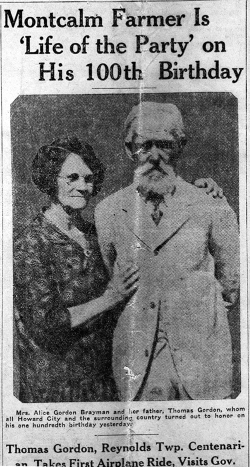 100th Birthday Celebration. Alice E. (Gordon) Brayman and her father, Thomas Gordon, are picture at the celebration in honor of his 100th birthday, which took place in Howard City, Montcalm Co, Michigan on September 23, 1930 or 1930. Thomas was born in England on September 23, 1830-31.