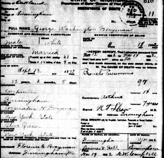 George W Brayman was born to Cornelius H Brayman, Sr and Olive Green on Sept. 13, 1847 in Birmingham, Oakland Co, Michigan. He married Mary Jane Buck on July 4, 1869 and they had 14 children between 1871 and 1895. George died Nov. 18, 1902 in Birmingham.
