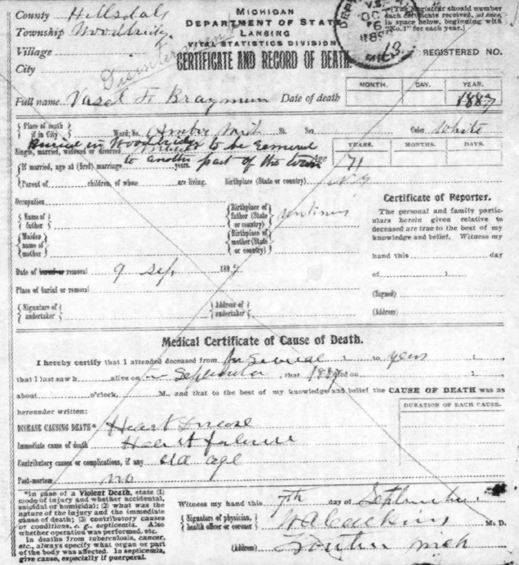 Varsel Brayman was born to Jeremiah Brayman and Mary Fuller about Feb. 21, 1816 in Fort Edward, Washington Co, New York. He married Delilah Unknown around 1837 and had three children between 1838 and 1846. In 1865, the family moved to Woodbridge twp., Hillsdale Co., Michigan, where Varsel died on Sept. 7, 1887.