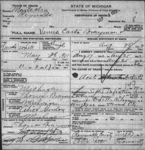 Venus Carita Brayman was born to Thomas Layton Brayman and Alice E Gordon on May 28, 1901 in Reynolds twp., Montcalm Co., Michigan. She was eleven years old when she died there on Aug. 25, 1912.