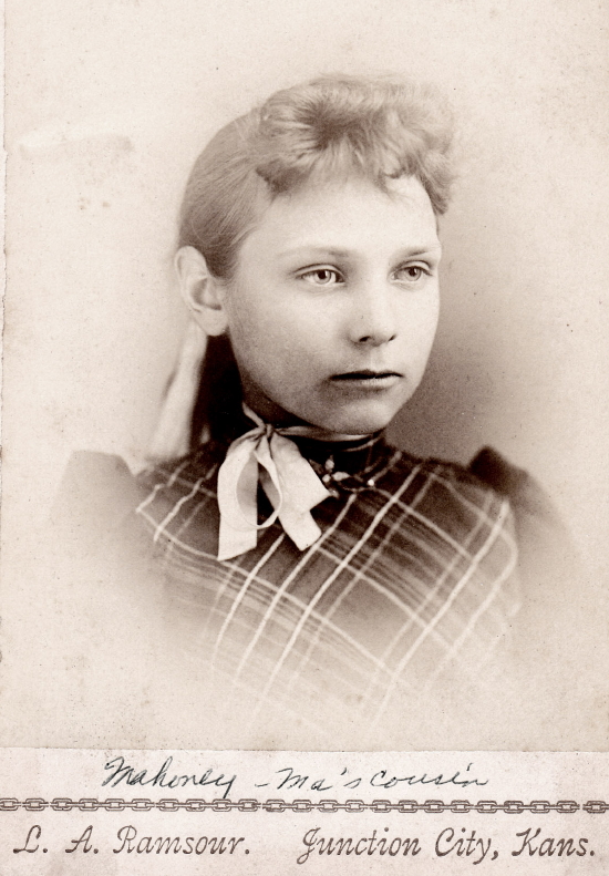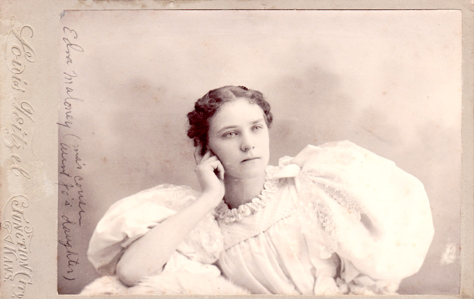 Edna Chryscilda Maloney was born Jan 11, 1878 in Jefferson twp., Hillsdale Co, Michigan to David and Josephine (Casterline) Maloney. She married John G Shaw. Edna died Oct 28, 1907 in Gratiot Co, Michigan. The photo was taken in Junction City, Geary Co, Kansas.