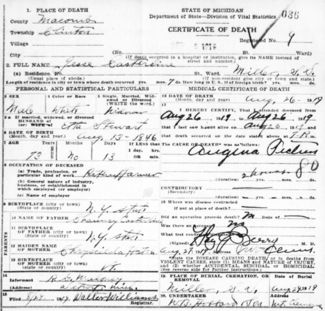 Jesse Rodman Casterline was born to Chauncey Casterline and Chryscilda Hatch on Aug 18, 1846 in Burns, Allegany Co, New York. Between 1860 and 1875, Jesse moved to South Dakota, where he married Etta R Lewis in 1875. They had two children, Jessie M and Lorton R between July 1884 and Nov. 1887. Etta died in Hand Co., South Dakota in 1914. Jesse was living in Miller, South Dakota in June 1919, but died in Clinton twp, Macomb Co, Michigan, apparently while on there visiting his nephew, R. G. Maloney (Raymond George Maloney), the informant on his death certficate.