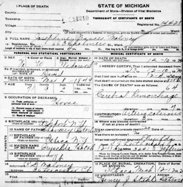 Josephine Francis Casterline was born to Chauncey Casterline and Chryscilda Hatch on Dec 22, 1842 in Arkport, Steuben Co, New York. She married Alpheus David Maloney on Jul 03, 1868 in North Adams, Hillsdale Co, Michigan. They had 5 children between Sept. 1869 and Jun. 1894. Josephine was living in Detroit, Wayne Co, Michigan when she died on Dec 10, 1920.
