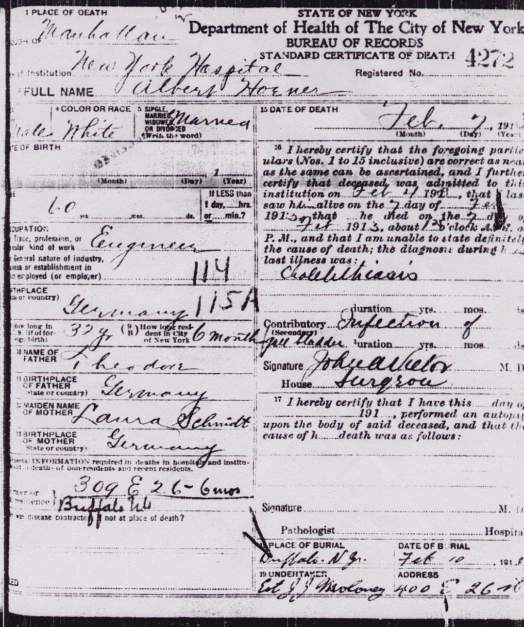 Albert was admitted to New York Hospital, Manhattan, NY, on Feb. 4, 1913 and died three days later of infection of the gall bladder, on Feb. 7, 1913. He was buried in Buffalo, Erie Co, New York on Feb. 10, 1913. Though his mother was listed as Eleanor Von Zuccalmaglio on his birth record, his death certificate lists her as Laura Schmidt. The reason is unknown but most likely an error by hospital staff, or Schmidt was substituted, by Albert, for the longer name of Von Zuccalmaglio, for convenience and to avoid a "spelling lesson".