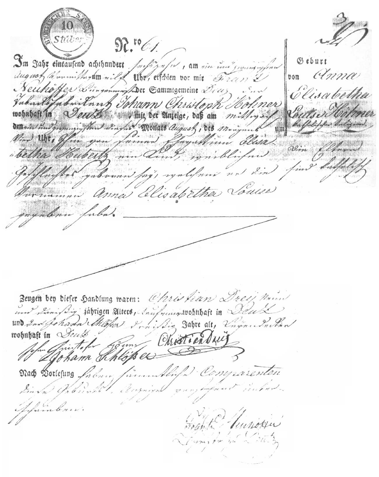 Anna Elisabeth Louise Hoener The birth record of Anna Elisabeth Louise Hoener, dated on August 21, 1816, in Deutz, Germany.