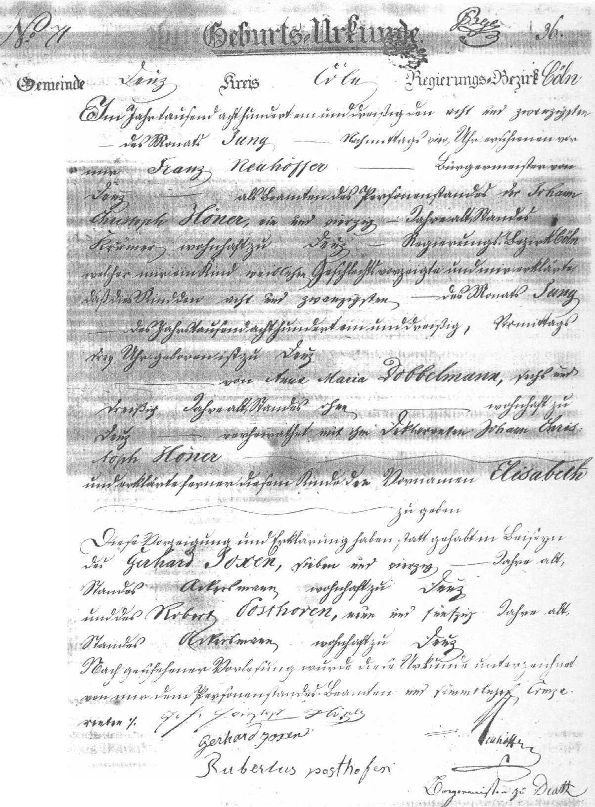 Elisabeth Hoener The birth record of Elisabeth Hoener, dated on June 28, 1831, in Deutz, Germany.