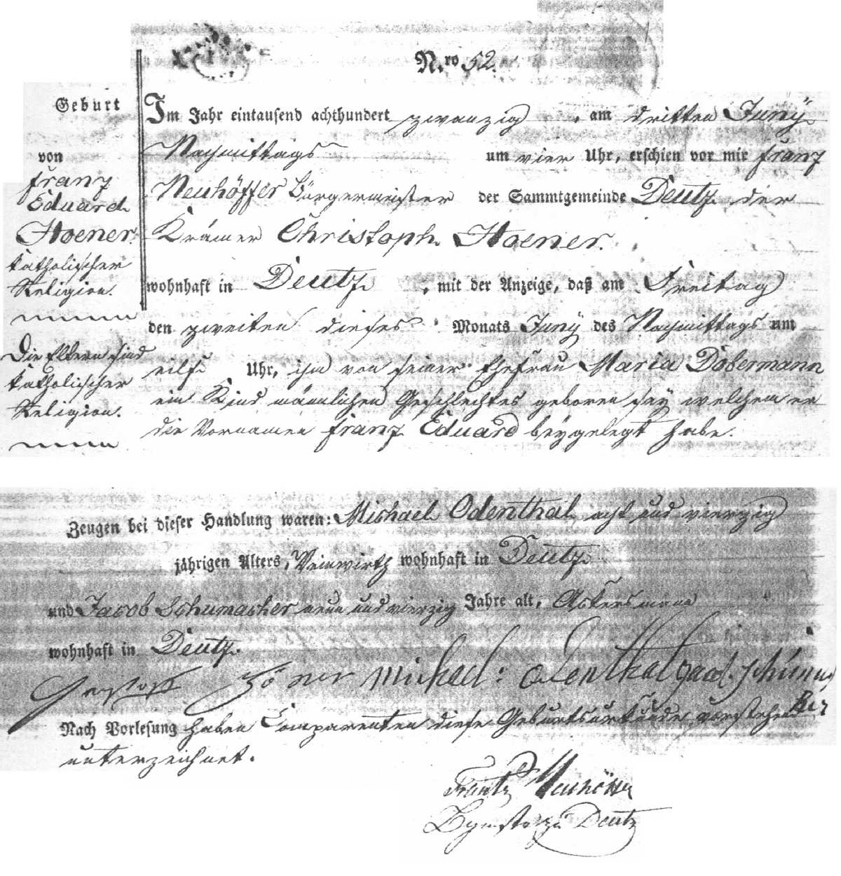 Franz Eduard Hoener The birth record of Franz Eduard Hoener, dated on June 2, 1820, in Deutz, Germany.