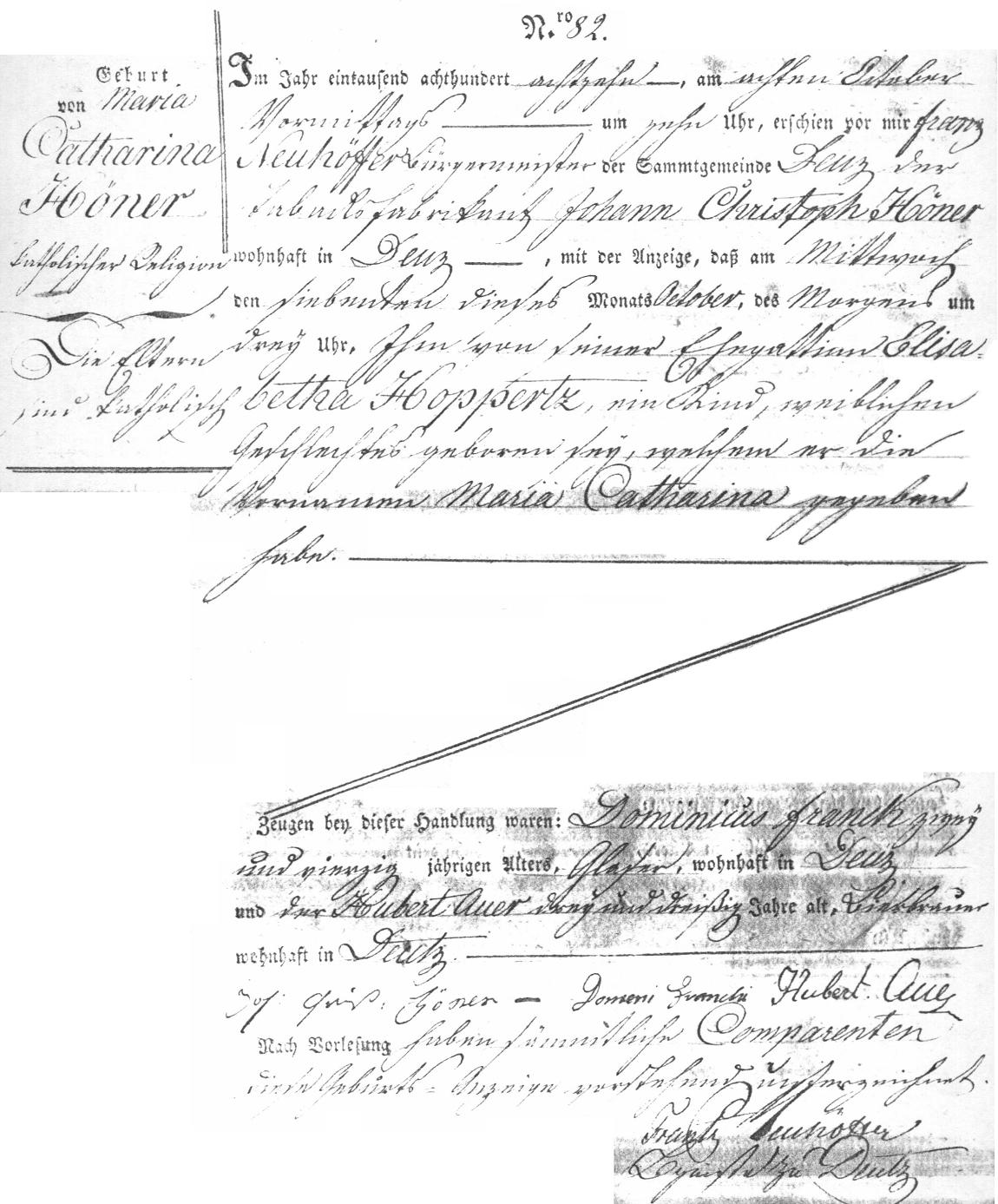 | BIRTH RECORD OF MARIA CATHARINA HOENER |