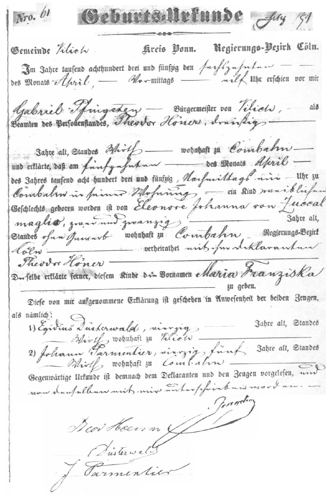 | BIRTH RECORD OF MARIA FRANZISKA HOENER |