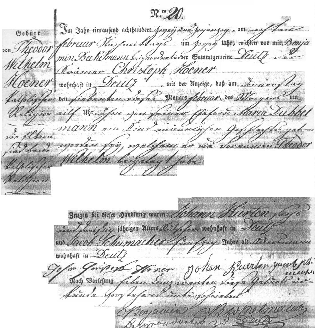 Theodor Wilhelm Hoener The birth record of Theodor Wilhelm Hoener, dated on February 7, 1822, in Deutz, Germany.