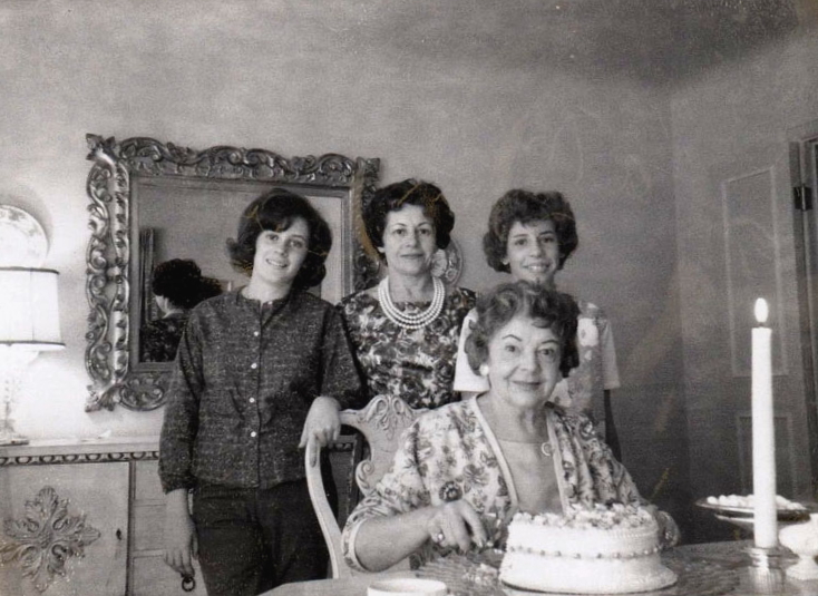 Mother Margaret (Fellabaum) Hoener cuts her cake, while daughter, Miriam (Hoener) Sinclair, and her daughters look on.