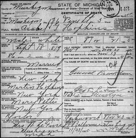 Asahel G Hopkins died Nov 21, 1905 in Muskegon, Muskegon Co, Michigan at 86 years old. He was born Sept 18, 1819 in Washington Co, New York, the son of Martin Hopkins and Sarah Ann (Sally) Pettis.