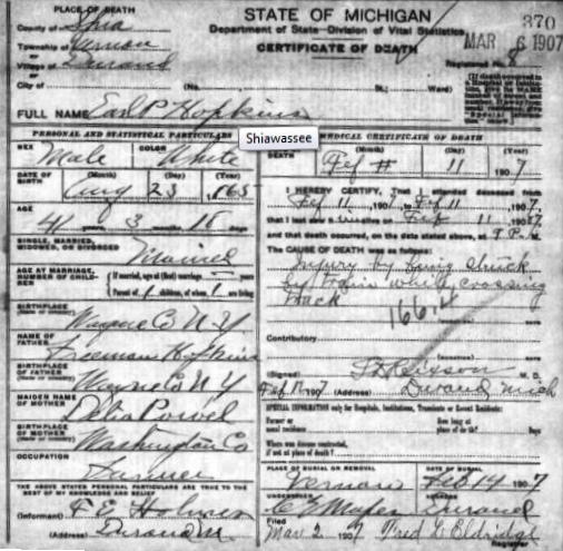 Earl P Hopkins was born to Freeman Hopkins and Delia Powell in Wayne Co., New York on August 23, 1865. He died February 11, 1907 in Durand, Vernon twp., Shiawassee Co, Michigan |