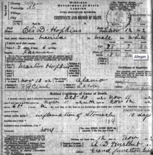 Eli D Hopkins was born to Martin Hopkins, Jr. and Sabrina Green in New York on January 23, 1824. He died November 12, 1902 in Allegan Co, Michigan Eli married Mary Ann Braman in 1844 in New York. She is the daughter of Seth Braman and Dorcas Green. Eli and Mary Ann Hopkins had seven children between 1845 and 1863, all except the first were born in Michigan. |