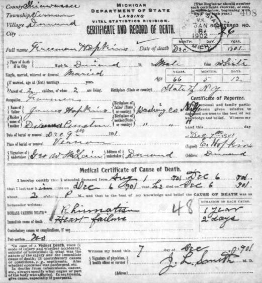 Freeman Hopkins was born to James Hopkins, Jr. and Diana Unknown in June 1835 in Wayne Co., New York. He died on Dec 06, 1901 in Durand, Shiawassee Co., Michigan. His mother's maiden name is on his certificate of death above, however it is difficult to determine the name. |