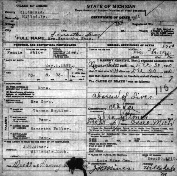 Samantha Hopkins was born to Thomas Hopkins and Samantha Fuller on May 1, 1837 in Wayne Co., New York. She married Ezra Merritt Shaw in 1861 in New York and had three children between Dec. 1862 and Sept. 1870. Samantha died Dec. 24, 1910 in Hillsdale, Hillsdale Co., Michigan.