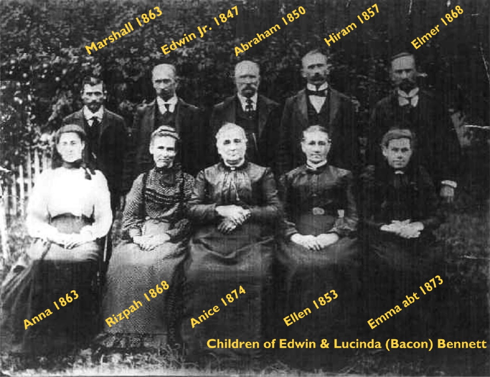 Lucinda Calista Bacon was born Jan 15, 1830. She married Edwin Bennett, probably in Crawford Co, Pennsylvania. He was born in Jun 1826. Their ten children are pictured above. Back Row L to R: Marshall E. BENNETT born May 21, 1863, Edwin L. BENNETT, Jr. born abt. 1858, Abraham S. BENNETT born Nov 25, 1850, Hiram L. BENNETT born 1857, and Elmer A. BENNETT born Sep 05, 1868 Front Row L to R: Unsure-must be Alice BENNETT born 1848 (but identified by a cousin as "Anna b. 1863"), Ripsah L.BENNETT born Feb 7, 1866, Anice L. BENNETT born Aug 7, 1874, Amanda Ellen BENNETT born Jun 12, 1853, Emily C. BENNETT born abt 1873.