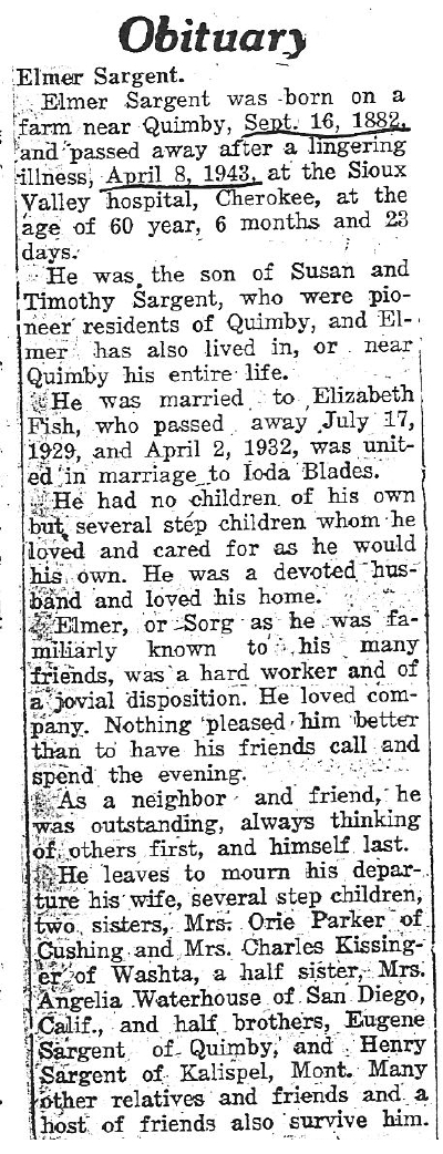 Elmer Sargent, born September 16, 1882, is the son of Timothy Benjamin and Susan (Fox) Sargent.