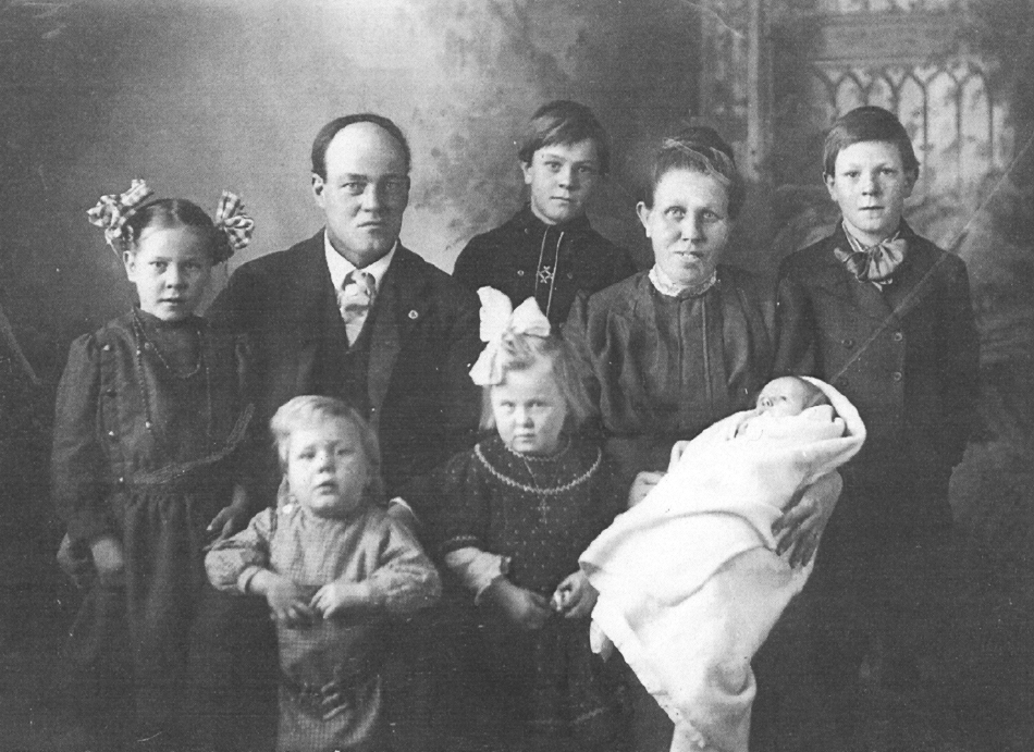 Orin & Elizabeth (Sargent) Parker, with six, of their nine children. Taken about 1904.