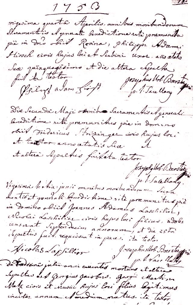 On the 2nd Day of May, in the year 1753, with all the sacraments and General Benediction rites provided in Christ, died Frideric STRITZINGER, local citizen and weaver. His age at death (not listed), and who on the following day was laid to rest. |