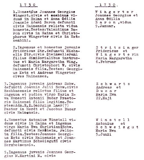 "Noble & Respectable Frideric Stritzinger, son of the late/deceased Michael Stritzinger, citizen of Steinweiler, with provisions, and Maria Margaretha Wingerter, daughter of the late/deceased Christopher Wingerter. |