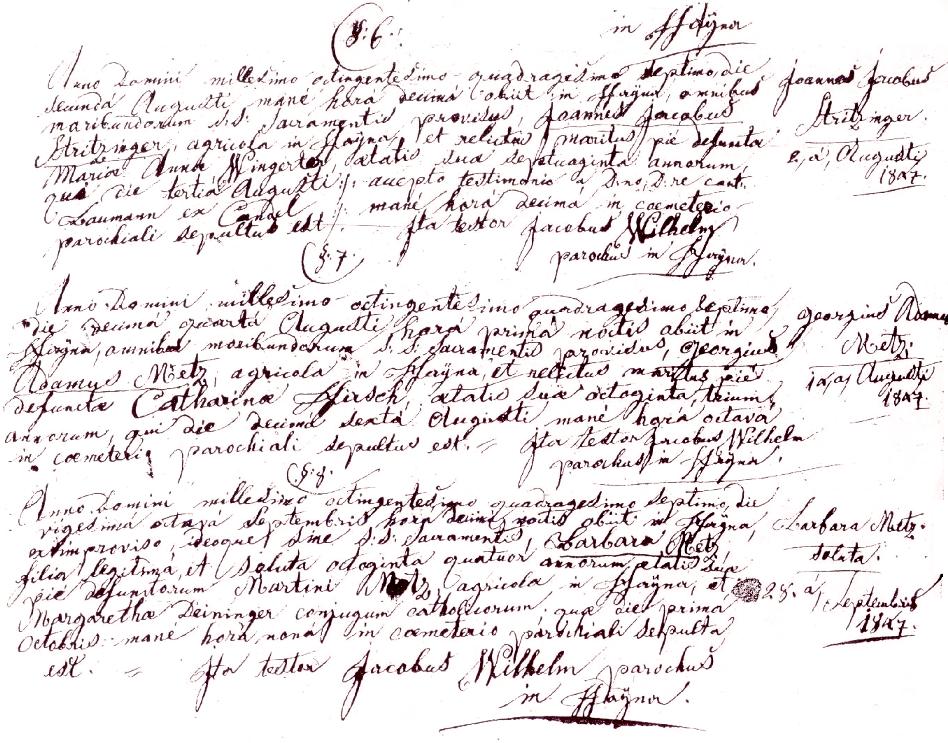 In the year of Our Lord, 1847, on the 2nd day of August, in the 10th hour of the morning, died in Hayna, with all the sacramental last rites provided, John Jacob STRITZINGER, farmer in Hayna, and unfortunate widower of the late/deceased Maria Anna WINGERTER. His age at death was 70 years, and who on the 3rd day of August, as witnessed by the Rev. in Christ, Laumann from Kandel, was laid to rest in the local Catholic Cemetery in the 10th hour of the morning. |