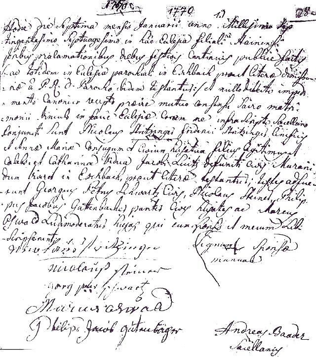 Today, the 7th day of January, in the year 1770, a proclamation, in the presence of those assembled in the Parish of Erlenbach, without any known impediments and by mutual consent, a sacred Matrimonial union, as written(?) by me below, between Nicolaus STRITZINGER, legitimate son of Frideric STRITZINGER and his spouse Anna Maria and Catherine, widow of the late Jacob LINTZ, citizen and miner from Erlenbach. |