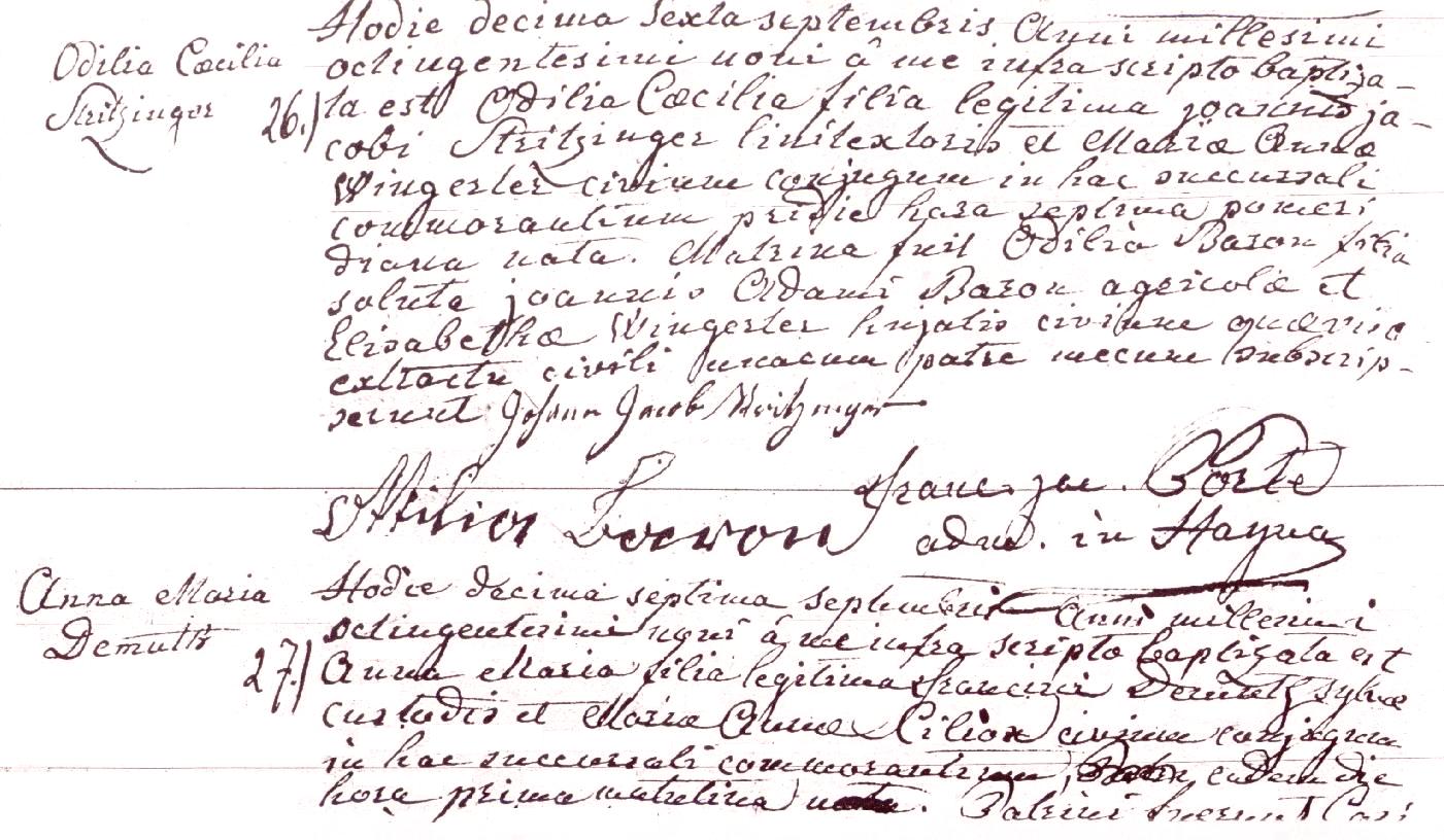 Odilia Caecilia Stritzinger Hayna, Bayern, Germany Today, the 16th Day of September, in the year 1809, as written by me below, was baptized Odilia Cecilia, the legitimate daughter of Johann Jacob STRITZINGER, citizen weaver, and his spouse Maria Anna WINGERTER, and on the day before, September 15, was born in the 7th hour of the afternoon/evening. Godmother of the child is Odilia BARON, the respectable daughter of Johann Adam BARON, farmer, and his spouse Elisabeth WINGERTER.