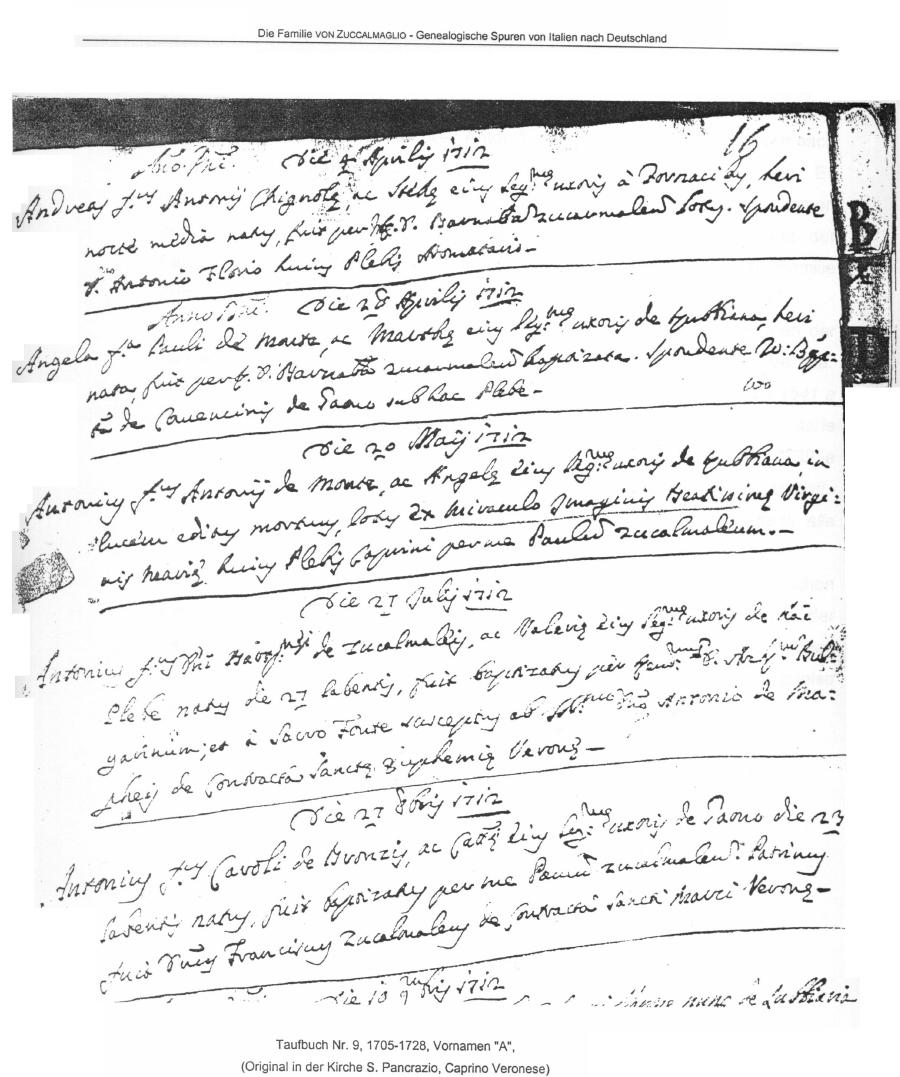 The baptism of Antonio Simeon von Zuccalmaglio, (fourth from the top) dated on July 21, 1712, in Caprino Veronese, Italy. Original in San Pancrazio church. Caprino Veronese, Italy is a small village in the hills at the foot of Mount Baldo. It lies between the Adige Valley and the Lake Garda, very close to Verona. It is less than one hour's drive from Venice, and an hour and a half from Milan.