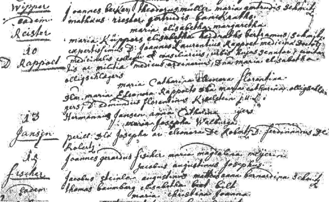 The baptism of Maria Catharine Eleonora Florentine Rappold, dated on February 10, 1755, daughter of Johann Laurentius/Laurenz Rappold and Maria Elisabeth Olligschläger. Record from Sankt Lambertus Kirchen, Düsseldorf, Rheinland, Preussen - Germany
