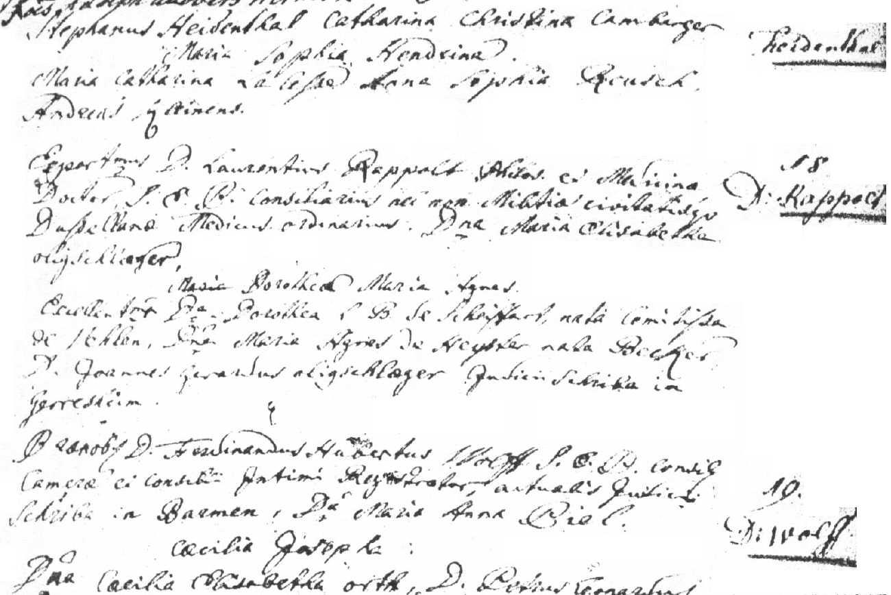 The baptism of Maria Dorothea Agnes Rappold, dated on May 18, 1746, daughter of Johann Laurentius/Laurenz Rappold and 2nd wife Maria Elisabeth Olligschläger. Record from Sankt Lambertus Kirchen, Düsseldorf, Rheinland, Preussen - Germany