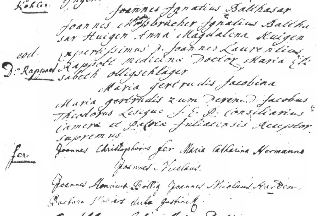 The baptism of Maria Gertrud Jacobina Rappold, dated on July 31, 1744, daughter of Johann Laurentius/Laurenz Rappold and 2nd wife Maria Elisabeth Olligschläger. Record from Sankt Lambertus Kirchen, Düsseldorf, Rheinland, Preussen - Germany