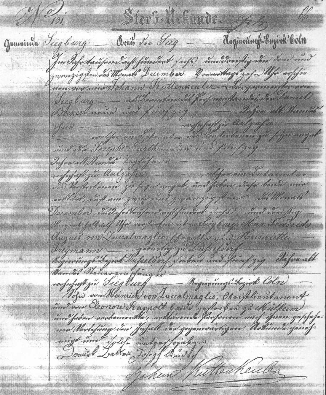 Maximilian Friedrich August von Zuccalmaglio The death record of Maximilian Friedrich von Zuccalmaglio, dated on Decemeber 22, 1836, in Siegburg, Rheinland, Germany.