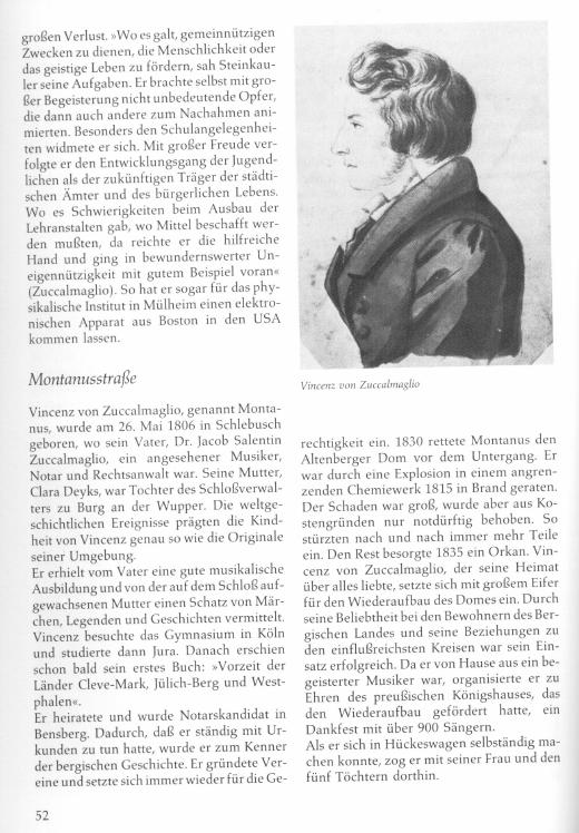Above is a two page sketch on Vinzenz von Zuccalmaglio (also known as Montanus) and his wife and five daughters. In 1846, he wrote an excellent book about Mülheim "Geschichte und Beschreibung der Stadt und des Landkreises Mülheim am Rhein" (History and description of the city and the district Muelheim on the Rhine). Source: "Mülheim am Rhein" von Inge Prass, Stadtgeschichte in Straßennamen" 1988