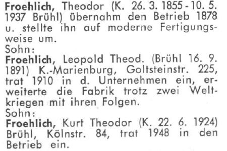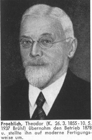 Theodor Fröhlich was born Mar 26, 1855, the son of Joseph Fröhlich, b. 1827. He died May 10, 1937, in Brühl, Germany.