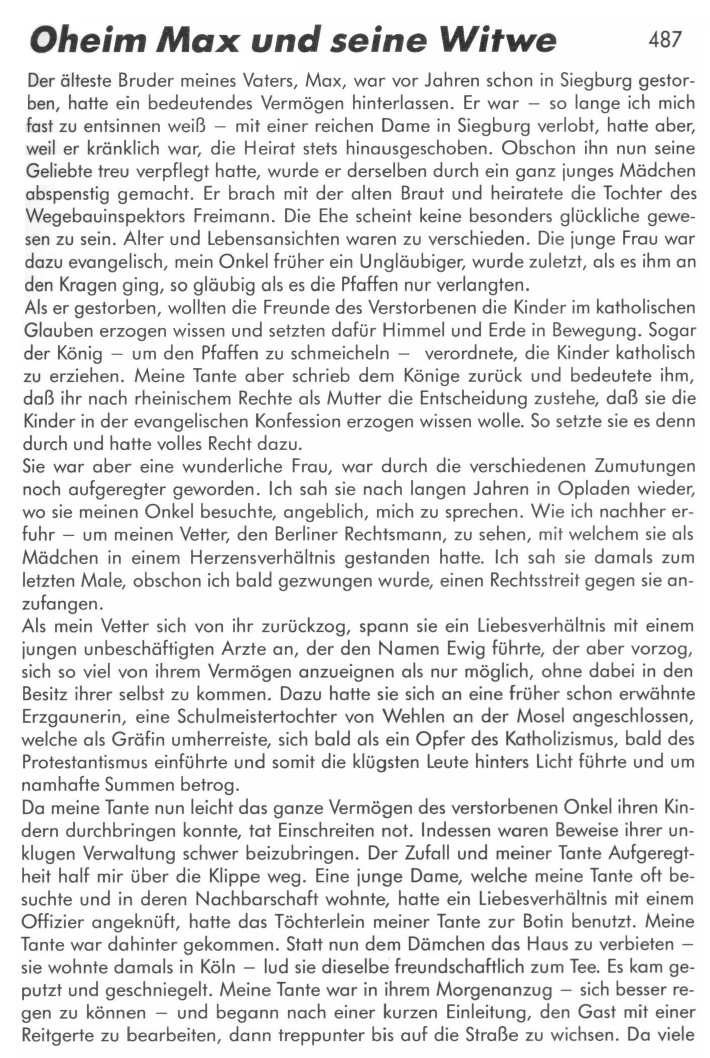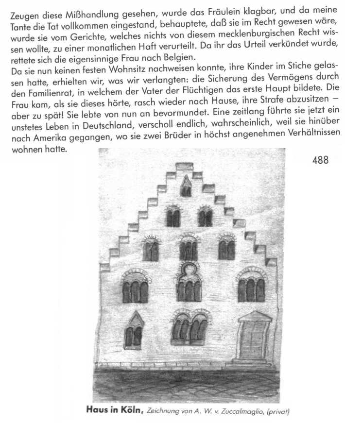 | Maximilian von Zuccalmaglio married Anna Henrietta Freymann on Jul 18, 1827. He died 9 years later on Dec 22, 1836. Maximilian's nephew, Anton Wilhelm von Zuccalmaglio, later wrote about his uncle and the widow he left behind; "The eldest brother of my father, Max, had died years ago in victory castle, in Siegburg [Germany] and left behind a large estate. He was once engaged to a rich lady in Siegburg, however the marriage was postponed. Uncle Max left the rich lady and married the daughter of the construction of roads supervisor, Freimann. The marriage does not seem to have been a good one. Their age difference and their lifestyles were too different. The young woman, Henrietta, was an Evangelist and Max was a Catholic. After Max died, his family and friends of the deceased wanted the children to be educated in the catholic faith. The family wrote to the King and the King gave the order to educate the children catholic. My aunt, however, wrote to the King that being the mother, she has the right and is entitled to the decision to educate them in the Evangelish denomination. Thus, she raised them as she wished. She had the right. She was however a remarkable woman, even with the unreasonable demands and became even more exciting. After much time in Opladen, I later learned Henrietta had an affair with a judge in Berlin, a cousin of mine, although I was soon forced to begin a lawsuit against her. She had another affair with a young physician, Mr. Ewig, who was more interested in her money and relieved her of a large sum. The von Zuccalmaglio family was angry that Henrietta would use Max's money for herself and not for the children. It was difficult to prove Henrietta's poor administration of Max's estate, however, it was a coincidence that my aunt's own behavior helped. A young lady, who my aunt often visited, and who lived in the neighborhood, was having an affair with a young soldier. The young woman had used a daughter of my aunt, as a messenger for her love affair with this officer. When Henrietta learned of this - she lived in Koln at the time - instead of forbidding her daughter from returning to the woman's home, she invited the neighbor for coffee. She dressed in a morning suit - necessary for flexibility - and when the lady arrived, proceeded to beat her with a riding whip down the stairs and out to the street. Many people saw this action and she was charged. And since my aunt admitted to the act, she was sentenced to one month detention. Because of the verdict, the stubborn woman left her children and her property and fled to Belgium. Because it could now be proven that the children had no stable home, her father assumed guardianship. Henrietta soon returned and served her punishment. She lived under guardianship. Later she traveled all over Germany and eventually disappered. It was suspected that she went to America where she had two brothers who were living a comfortable life."