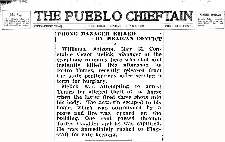 Victor Melick was born June 18, 1867 in Vernon Co, Missouri, the son of Wesley Melick and Mary Dodge. He died on May 31, 1919 in Williams, Coconino Co, Arizona. Victor, a Constable, was murdered by Pedro Torres.