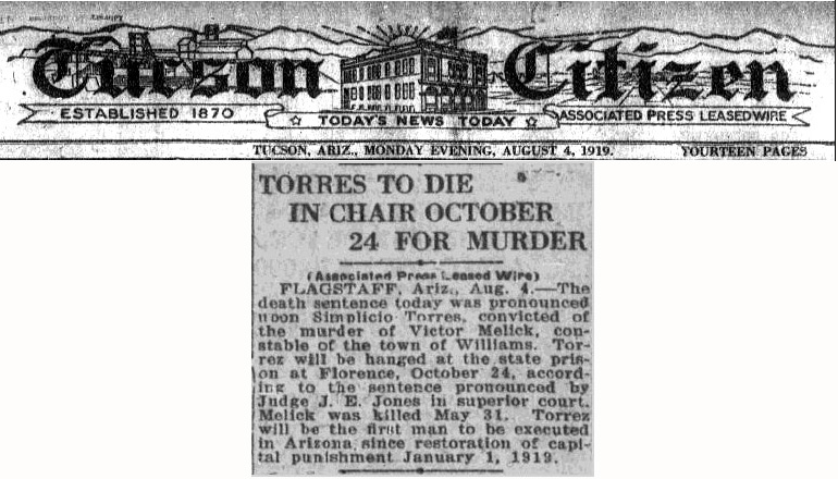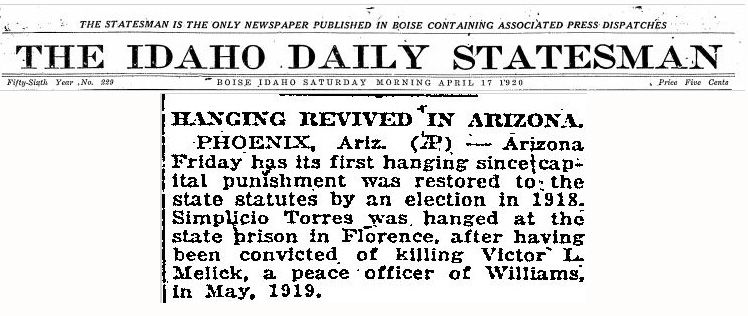 Torres is hanged in Florence, Arizona for the murder of Victor Melick.