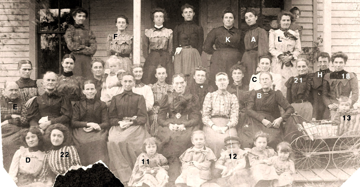 Previously believed to be Rillie E (Fuller) Hutchins (38 yrs old), daughter of Amanda (Hopkins) Fuller (#B), the mother of Iva Hutchins (#D), and aunt of Maude Arcelia (Hatch) Sargent (#18). HOWEVER, this woman does not appear to be 38 years of age. Almost certainly, this is Juliette (Cary) Kingsley, who was born about 1843. This meeting took place in June of 1900, making Juliette abt. 57 yrs old, which is more consistant with her appearance in this photo. Also, Juliette is standing next to her sister, Helen (Cary) Sargent (#21). Helen and Juliette lived on ajacent in Woodbridge township. The woman we had previously believed to be Juliette (#L), is, no doubt, her daughter, Mary (Kingsley) Unknown (abt. 31 yrs old). Compare the known picture of Juliette Cary (Group 29) with Woman H. Then compare with woman L.