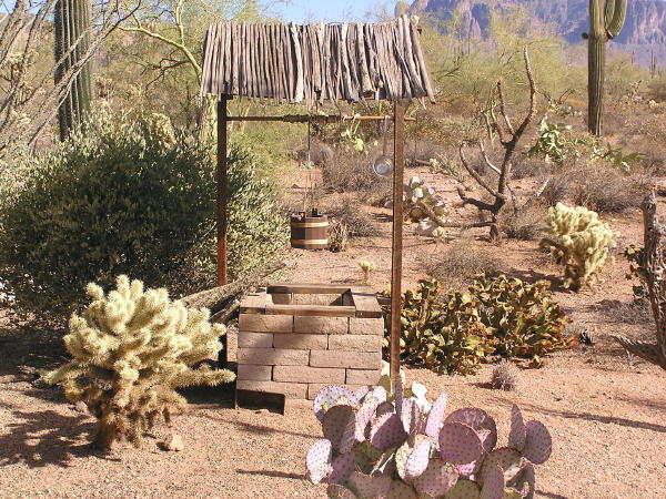 | WATER....I NEED WATER! Minin' all that gold done give this feller a mighty big thirst. Jest cain't figur whichen site is purdier...dis here well, or.....this next one... |