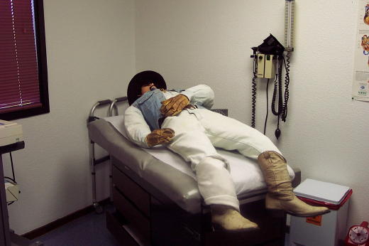 Jake sat in the Emergency Room and began to feel weak. Joanne told Jake to think happy thoughts and be brave. | |