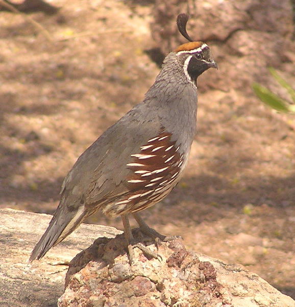 CRITTER STOP The male Gambil Quail always plays "lookout" so the family can eat without being eaten. That's the watering trough in front of him. |