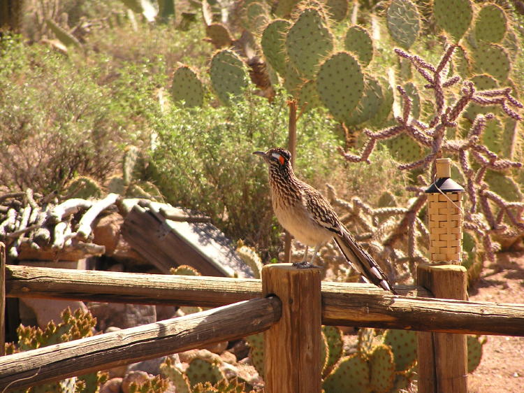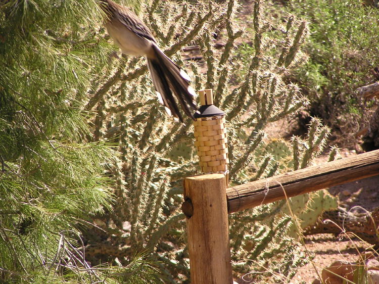 By this time, Runny had spent more than 5 hours, running frantically around the mirror. He was really upset. So, we decided to give him a break. We snuck out and removed the mirror, and left some ground beef in it's place. Runny must have thought that he had killed the "other" roadrunner. He climbed up on the bridge....