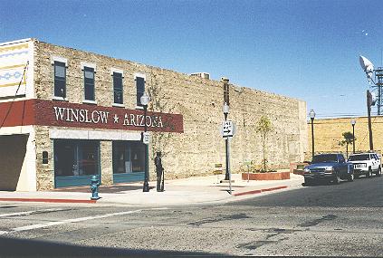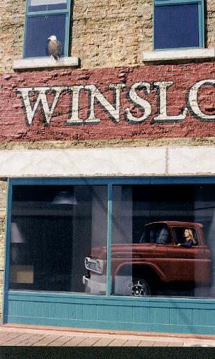 The Eagles sang it in the 70's. Now, there really is a guy 'standin' on the corner in Winslow, Arizona....although "he" is a bronze statue. It stands in front of an incredibly realistic mural, on the side of the nearby building. An "eagle", is "perched" on an upper level window ledge. In the first floor window is a "reflection" of the girl in the flatbed Ford. It looks so real that they say people wait for the eagle to take off. |