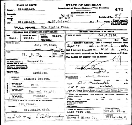 Clarissa Elmira Benson, daughter of Amundson Benson and Rachel Haight, was born July 17, 1843 in New York. She died Oct 3, 1916 in Hillsdale, Hillsdale Co, Michigan, six years after the death of her husband, Truman Paul, on July 1, 1910.
