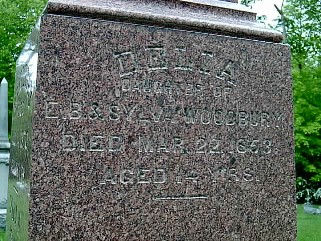 Delia Woodbury was born Abt. Mar 22, 1839 in Ohio and died Mar 22, 1853 in Jefferson, Ashtabula Co, Ohio. She is the daughter of Ebenezer Boswell and Sylvia (Benson) Woodbury. She is buried in Oakdale Cemetery |